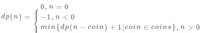 函数dp(n)表示,当前的目标金额n,至少需要dp(n)个硬币凑出该金额